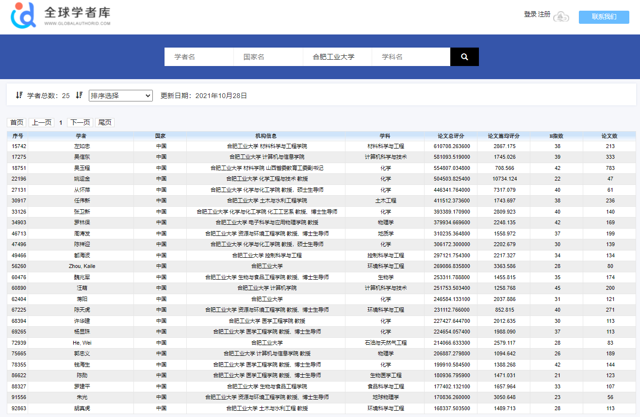 10月28日从国内全球学者库网站(www.globalauthorid.com)获悉,英国正版365官方网站罗林保教授入围全球顶尖前10万科学家名单(物理学科),该排名涵盖化学、生物学、基础医学、计算机科学与技术、环境科学与工程、材料科学与工程、地球物理、动力工程及工程热、冶金工程、生物工程、控制科学与工程、食品科学与工程、临床医学、基础医学、作物学、公共卫生与预防医学、管理科学与工程、控制科学与工程石油与天然气、化学工程与技术等二十个学科。此次合肥工业大学有25位学者成功入选,罗林保教授排名国内排名2885,全球34903。